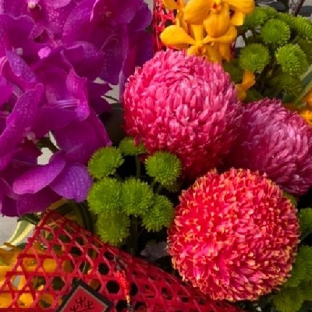 《花材》 牡丹菊、巨輪萬代蘭、乒乓菊、金楜椒 /尺寸 : H70 x W55 cm。 /花材偶有季節性,遇缺貨或品質不佳等情形,我們將為您做花材上的調整及設計。 /因花材為天然素材,故無法規格化,作品無法與目錄照片完全相同,敬請見諒。 /卡片內容字數五十字內,請於下單後在備註欄位填寫