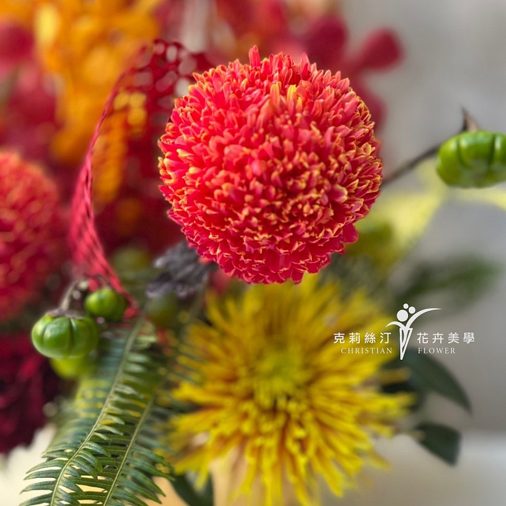 《花材》 牡丹菊、巨輪萬代蘭、乒乓菊、金楜椒 /尺寸 : H70 x W55 cm。 /花材偶有季節性,遇缺貨或品質不佳等情形,我們將為您做花材上的調整及設計。 /因花材為天然素材,故無法規格化,作品無法與目錄照片完全相同,敬請見諒。 /卡片內容字數五十字內,請於下單後在備註欄位填寫