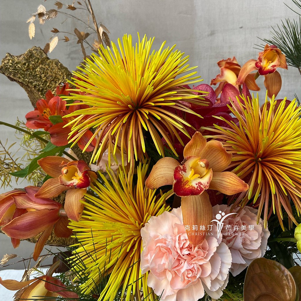 《花材》 牡丹菊、巨輪萬代蘭、乒乓菊、金楜椒 /尺寸 : H70 x W55 cm。 /花材偶有季節性,遇缺貨或品質不佳等情形,我們將為您做花材上的調整及設計。 /因花材為天然素材,故無法規格化,作品無法與目錄照片完全相同,敬請見諒。 /卡片內容字數五十字內,請於下單後在備註欄位填寫