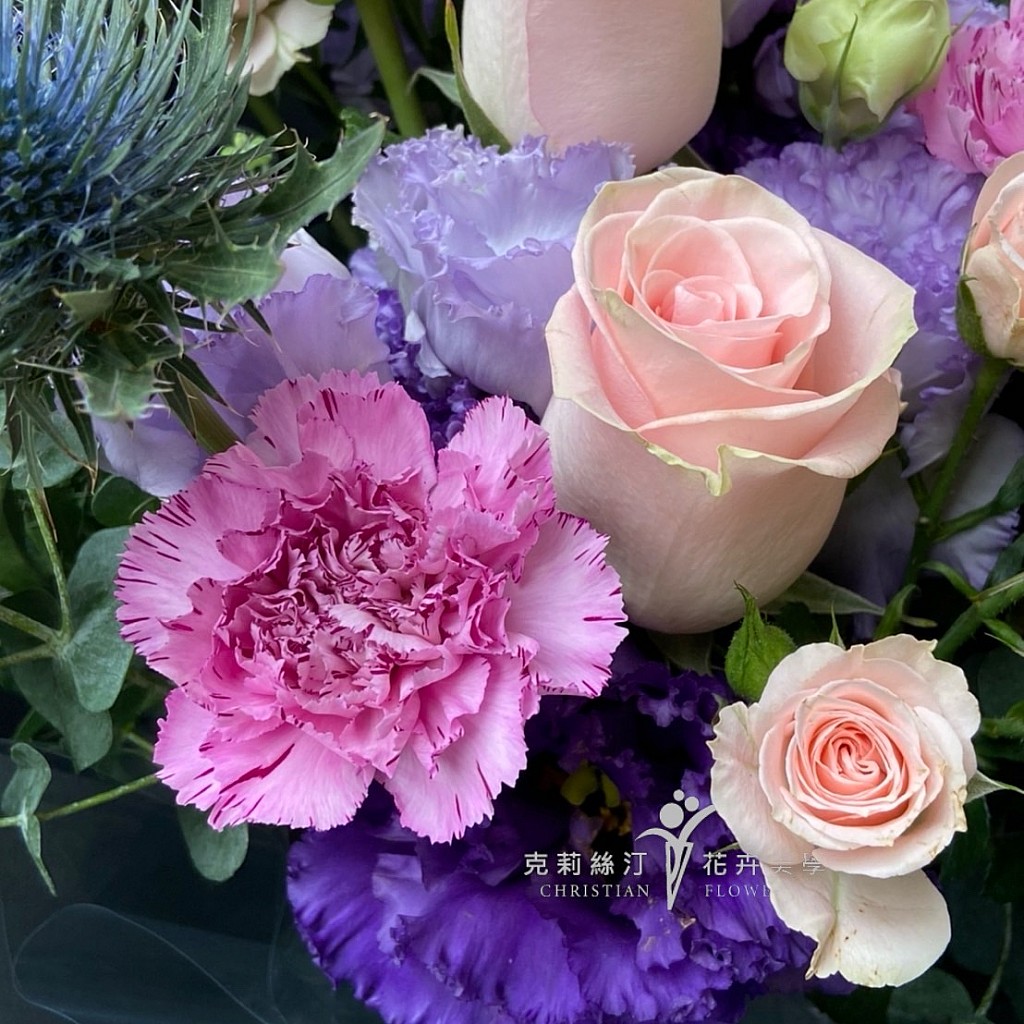 《花材》 康乃馨、玫瑰、桔梗、紫薊、尤加利 /尺寸 : H60 x W45 cm。 /花材偶有季節性,遇缺貨或品質不佳等情形,我們將為您做花材上的調整及設計。 /因花材為天然素材,故無法規格化,作品無法與目錄照片完全相同,敬請見諒。 /卡片內容字數五十字內,請於下單後在備註欄位填寫